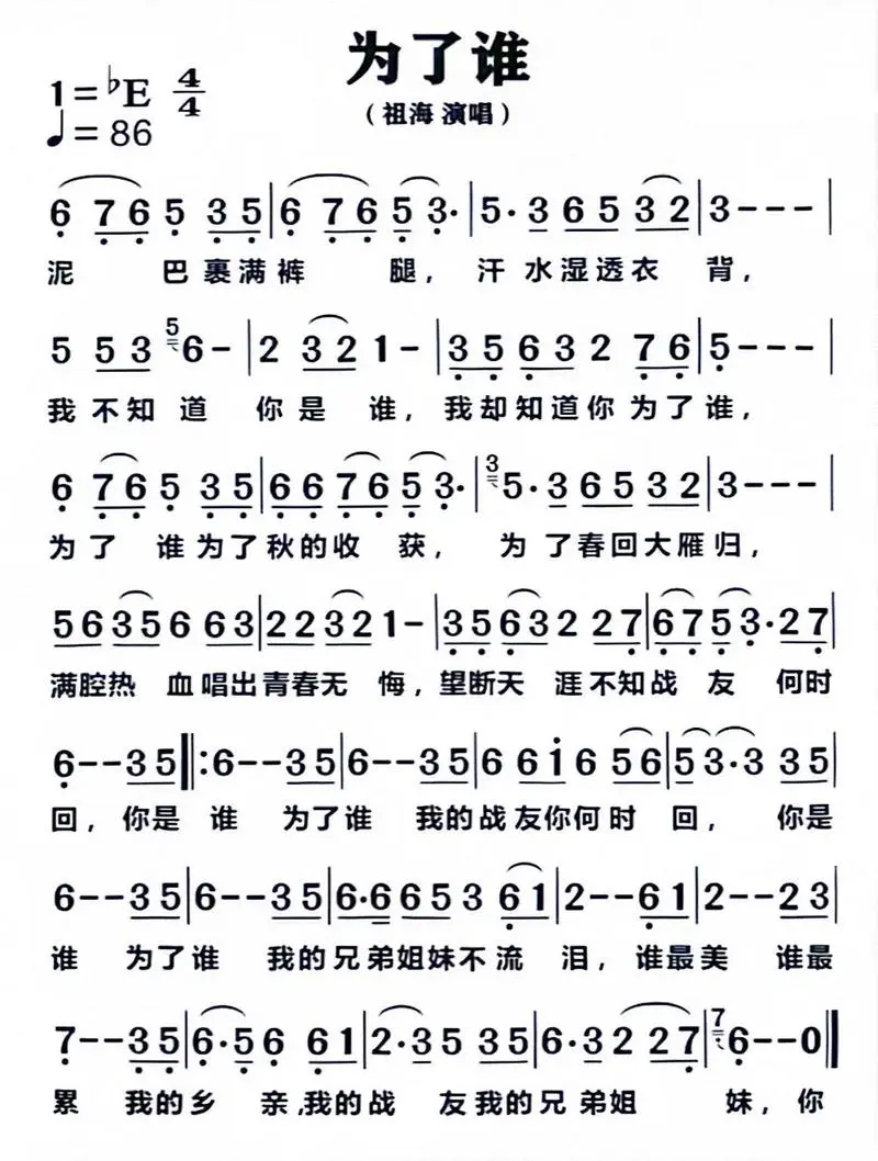 《为了谁》由陈涛作词、王祖皆和张卓娅作曲,创作于1998年抗洪抢险期间。歌曲原唱为祖海,后经众多艺术家演绎,成为中国家喻户晓的红色经典。其创作灵感源于抗洪前线战士的英勇事迹,歌词中“为了谁”的追问,既是对子弟兵奉献精神的深情礼赞,也是对军民鱼水情的生动诠释,至今仍在中华大地上广为流传,激励着无数人奋勇前行。