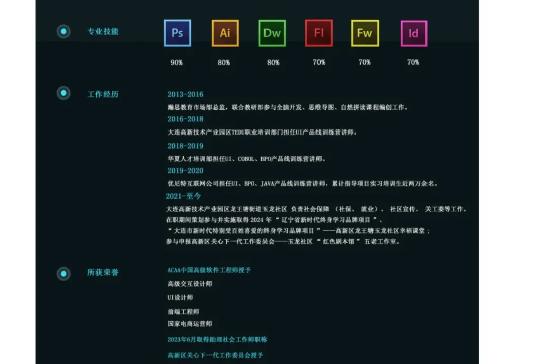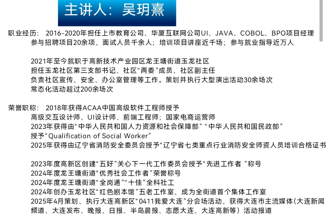 吴老师就职于高新技术产业园区龙王塘街道玉龙社区,担任玉龙社区第三支部书记、社区“两委”成员、社区副主任,负责社区宣传、安全、办公室管理等工作。此外,她在教育、互联网领域也担任过项目经理,参与众多招聘、培训和就业指导工作,指导过的项目实训生近两万余名,还拥有高级软件工程师等诸多专业资质与荣誉,2023年获人社部和民政部授予的“社会工作者职业资格”。吴老师在不同领域都有着出色的实践和成果,相信能给大家带来很多宝贵的分享。